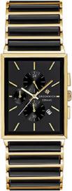 Мужской кварцевый хронограф. Механизм Miyota. Центральные часовая, минутная и секундная стрелки. 12/24х часовой формат времени. Секундомер. Черный циферблат. Прямоугольный корпус выполнен из нержавеющей стали с PVD покрытием цвета желтого золота. Размер корпуса составляет 34 х 47 мм. Стальной браслет с покрытием и керамическими вставками, раскладывающаяся застежка. Прочное минеральное стекло устойчивое к мелким механическим повреждениям. Водостойкость WR 50 (мытье рук, дождь).