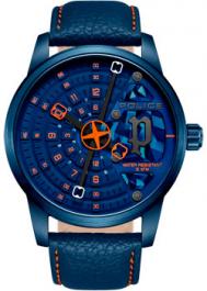 Кварцевые часы. Водостойкость WR 50 (мытье рук, дождь). Стрелки и метки с люминесцентным покрытием. Циферблат с часовыми индексами в виде цифр. Корпус выполнен из нержавеющей стали с IP покрытием. Диаметр корпуса 46 мм. Устойчивое к возникновению мелких механических повреждений минеральное стекло. Кожаный ремешок синего цвета.