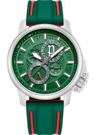 Кварцевые часы. Водостойкость WR 50 (мытье рук, дождь). Часы, минуты, секунды. Индикация даты и дня недели. 12/24х часовой формат времени. Стрелки и метки с люминесцентным покрытием. Циферблат с часовыми индексами в виде штрихов. Корпус выполнен из нержавеющей стали. Диаметр корпуса 44 мм. Устойчивое к возникновению мелких механических повреждений минеральное стекло. Силиконовый ремешок зеленого цвета.