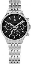 Женский кварцевый хронограф. Механизм Miyota. Центральные часовая, минутная и секундная стрелки. 12/24х часовой формат времени. Секундомер. Черный циферблат. Круглый корпус выполнен из нержавеющей стали. Диаметр корпуса составляет 35 мм. Заводная головка с защитой. Стальной браслет, раскладывающаяся застежка. Прочное минеральное стекло устойчивое к мелким механическим повреждениям. Водостойкость WR 100 (плавание без погружения).