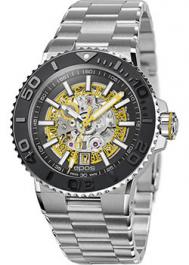 Мужские механические часы с автоподзаводом. Механизм Sellita SW200 на 26 камнях. Частота 28800 полуколебаний в час. Запас хода 38 часов. Центральные часовая, минутная и секундная стрелки. Индикатор даты. Серебристый скелетонизированный циферблат с желтым диском дат. Люминесцентные стрелки и метки. Круглый корпус выполнен из полированной нержавеющей стали 316L с частичным черным PVD покрытием по безелю. Диаметр корпуса составляет 43 мм, толщина 14,5 мм. Заводная головка с защитой. Стальной браслет, раскладывающаяся застежка. Устойчивое к возникновению царапин сапфировое стекло. Прозрачная задняя крышка. Водостойкость WR 500 (погружение с аквалангом).
