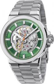 Мужские механические часы с автоподзаводом. Механизм Sellita SW200 на 26 камнях. Частота 28 800 полуколебаний в час. Запас хода 38 часов. Центральные часовая, минутная и секундная стрелки. Скелетонизированный зеленый циферблат. Круглый корпус выполнен из полированной нержавеющей стали 316L. Диаметр корпуса составляет 42 мм, толщина 10 мм. Заводная головка с защитой. Стальной браслет шириной 22 мм, раскладывающаяся застежка. Устойчивое к возникновению царапин сапфировое стекло. Прозрачная задняя крышка. Водостойкость WR 100 (плавание без погружения).