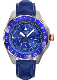 Кварцевые часы. Водостойкость WR 100. Центральные часовая, минутная и секундная стрелки. Индикация даты. Второй часовой пояс. Стрелки и метки с люминесцентным покрытием. Синий циферблат с часовыми индексами в виде штрихов и цифр. Корпус выполнен из нержавеющей стали с частичным PVD покрытием. Диаметр корпуса 43 мм, 11 мм. Устойчивое к возникновению мелких механических повреждений сапфировое стекло. Кожаный ремешок синего цвета.