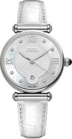 Механизм Ronda 705. Индикация числа. Перламутровый циферблат. Стальной корпус. Кожаный ремень. Диаметр корпуса 34 мм, толщина 7 мм. Заводная головка украшена сапфиром в форме кабошона. Циферблат украшен 8 бриллиантами.