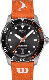 Мужские механические часы с автоподзаводом. Черный циферблат, люминесцентные стрелки, штрихи и точки. Отображение даты. Круглый корпус из нержавеющей стали. Синтетический ремешок. Сапфировое стекло с антибликовым покрытием с обеих сторон, защищающее от царапин и повреждений. Водонепроницаемость WR 300 (дайвинг). Минеральный безель, вращающийся против часовой стрелки, завинчивающаяся заводная головка и задняя крышка корпуса. Часы Tissot Seastar 1000 Wilson WNBA - это специальная серия часов, созданная в честь партнерства между компанией Tissot и Женской национальной баскетбольной ассоциацией (WNBA). Эту модель подчеркивают белые и оранжевые детали, повторяющие цвета WNBA.
