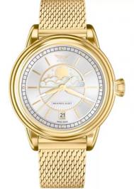 Кварцевые часы. Водостойкость WR 100. Часы, минуты, секунды. Индикация даты. Фазы Луны. Циферблат с часовыми индексами в виде штрихов и точек. Корпус выполнен из нержавеющей стали с PVD покрытием. Диаметр корпуса 35 мм, толщина 10 мм. Устойчивое к возникновению мелких механических повреждений сапфировое стекло с антибликовым покрытием. Браслет миланского плетения, выполнен из нержавеющей стали с PVD покрытием.