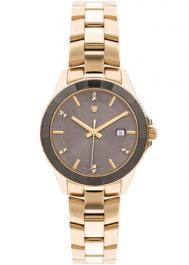 Кварцевые часы. Водостойкость WR 50. Центральные часовая, минутная и секундная стрелки. Индикация даты. Серый циферблат с часовыми индексами в виде штрихов. Корпус выполнен из нержавеющей стали с PVD покрытием. Диаметр корпуса 33 мм, толщина 8 мм. Устойчивое к возникновению мелких механических повреждений минеральное стекло с сапфировым напылением. Браслет выполнен из нержавеющей стали с PVD покрытием. Часы украшены цирконами.