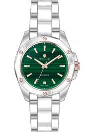 Кварцевые часы. Водостойкость WR 50 (мытье рук, дождь). Центральные часовая, минутная и секундная стрелки. Зеленый циферблат с часовыми индексами в виде штрихов. Корпус выполнен из нержавеющей стали. Диаметр корпуса 34 мм, толщина 8 мм. Устойчивое к возникновению мелких механических повреждений сапфировое стекло. Браслет выполнен из нержавеющей стали и керамики. Часы украшены бриллиантом.