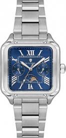 Женские кварцевые часы. Калибр механизма Ronda 706.1. Центральные часовая, минутная и секундная стрелки. Отображение даты и дня недели в малых циферблатах. Фазы Луны. Синий циферблат. Римская индикация времени. Квадратный корпус выполнен из нержавеющей стали. Размер корпуса составляет 32 х 32 мм, толщина 10 мм. Стальной браслет, раскладывающаяся застежка. Устойчивое к возникновению царапин сапфировое стекло. Водостойкость WR 30 (брызги).